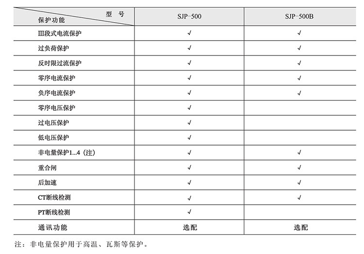SJP-500系列保護(hù)適用于線路保護(hù),電容出線保護(hù),廠用變保護(hù)和線路保護(hù)。針對(duì)被保護(hù)設(shè)備及保護(hù)要求的不同,SJP-500系列保護(hù)的型號(hào)和功能配置如下: