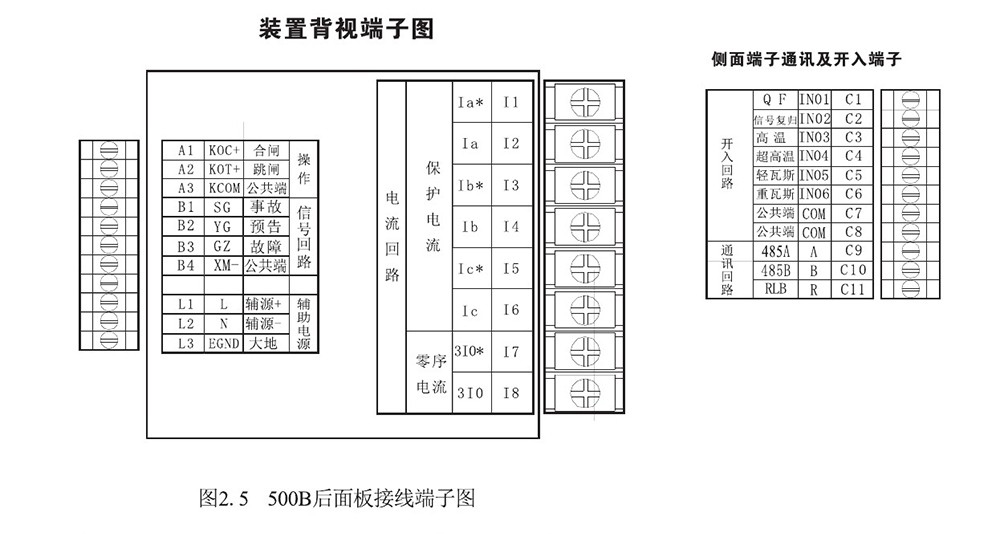 I1-I8端子為電流端子,其中11-I6端子為保護(hù)電流輸入端子,當(dāng)保護(hù)采用兩相式保護(hù)時(shí),I3、 14懸空。 I7、I8端子為零序電流輸入端子,帶*號(hào)為同名端,接線時(shí)請(qǐng)注意。