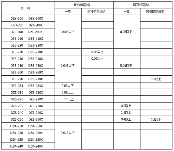 2.1動(dòng)作電壓與保持電壓不大于70%額定電壓, DZY(J)-220X動(dòng)作電壓不大于80%額定電壓;動(dòng)作電壓不小于30%額定電壓, DZK-200及DZB 243不小于50%額定電壓。